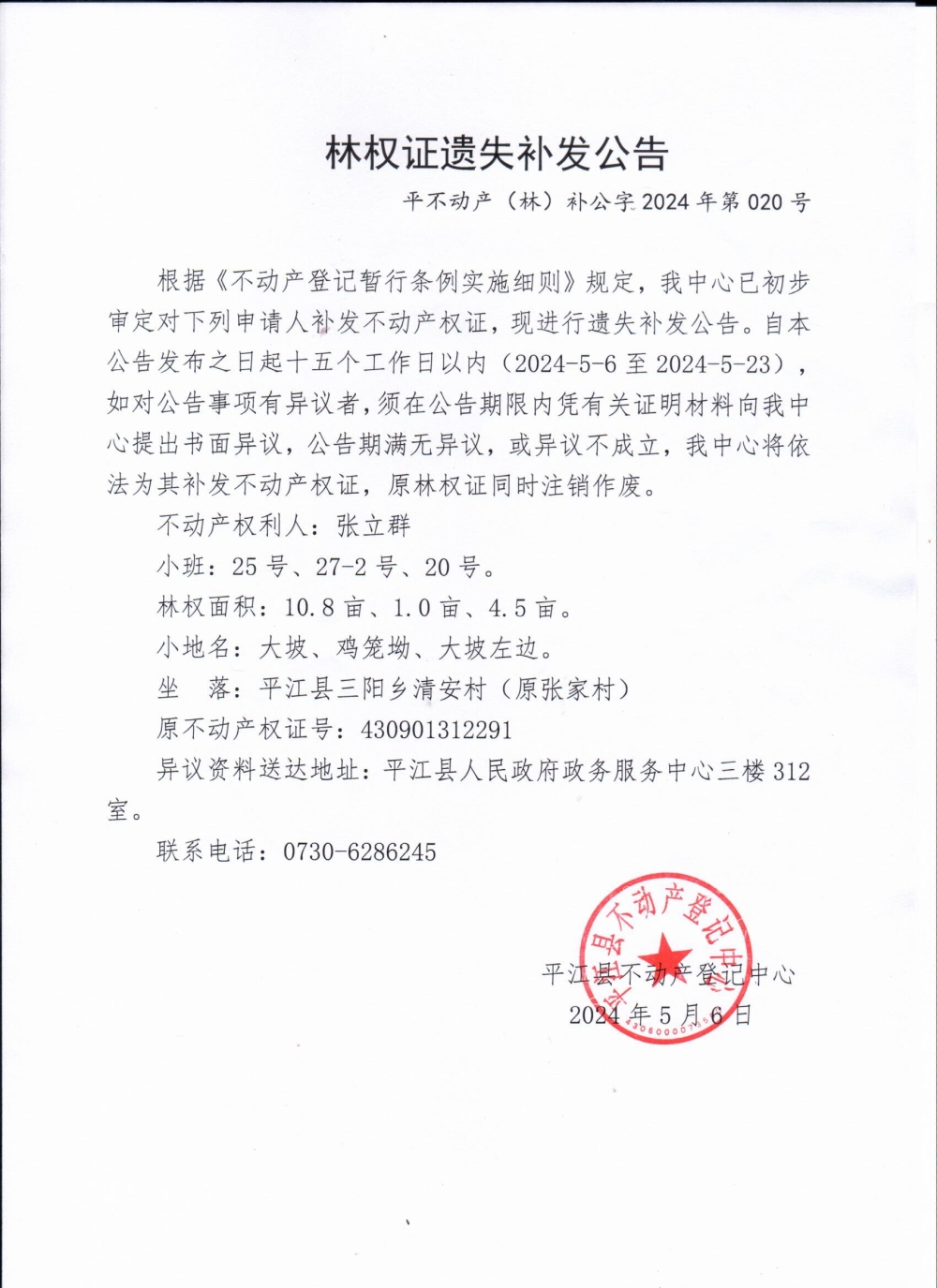 张立群林权证遗失补发公告