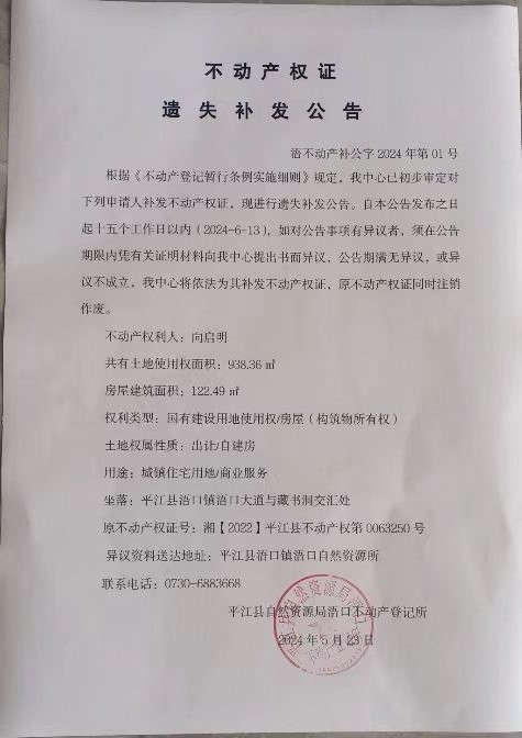 向启明 不动产权证遗失补发公告