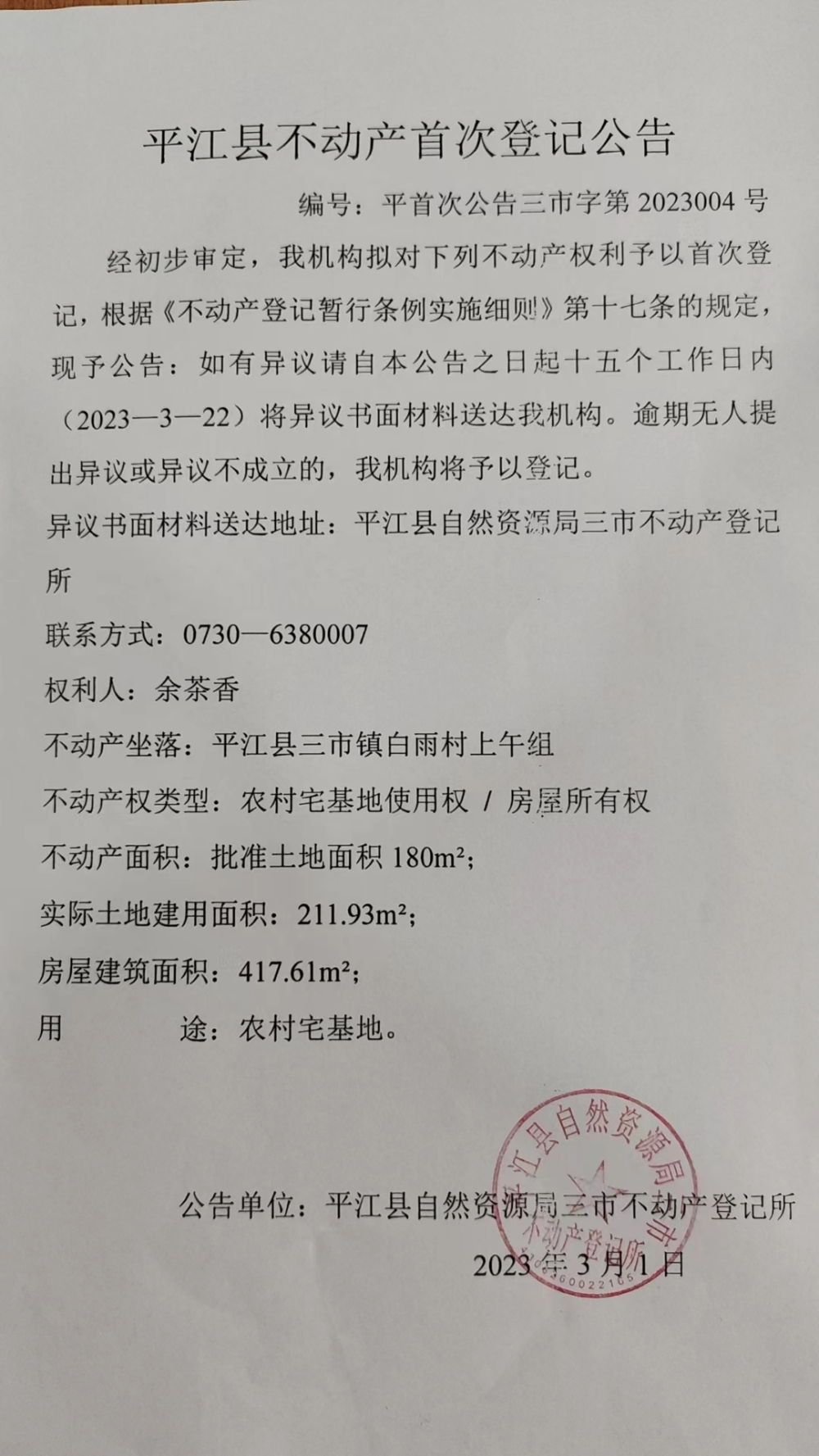 余茶香不动产权首次登记公告