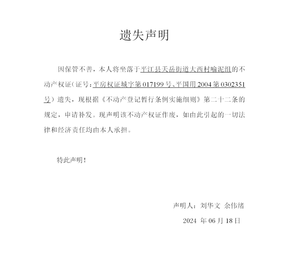 刘华文 余伟绪不动产权证遗失声明