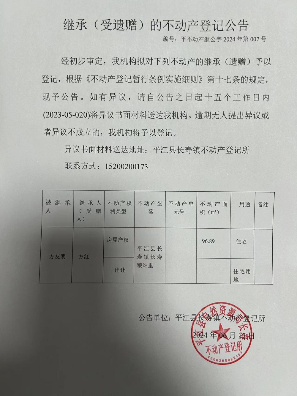 方红继承(受遗赠)的不动产登记公告