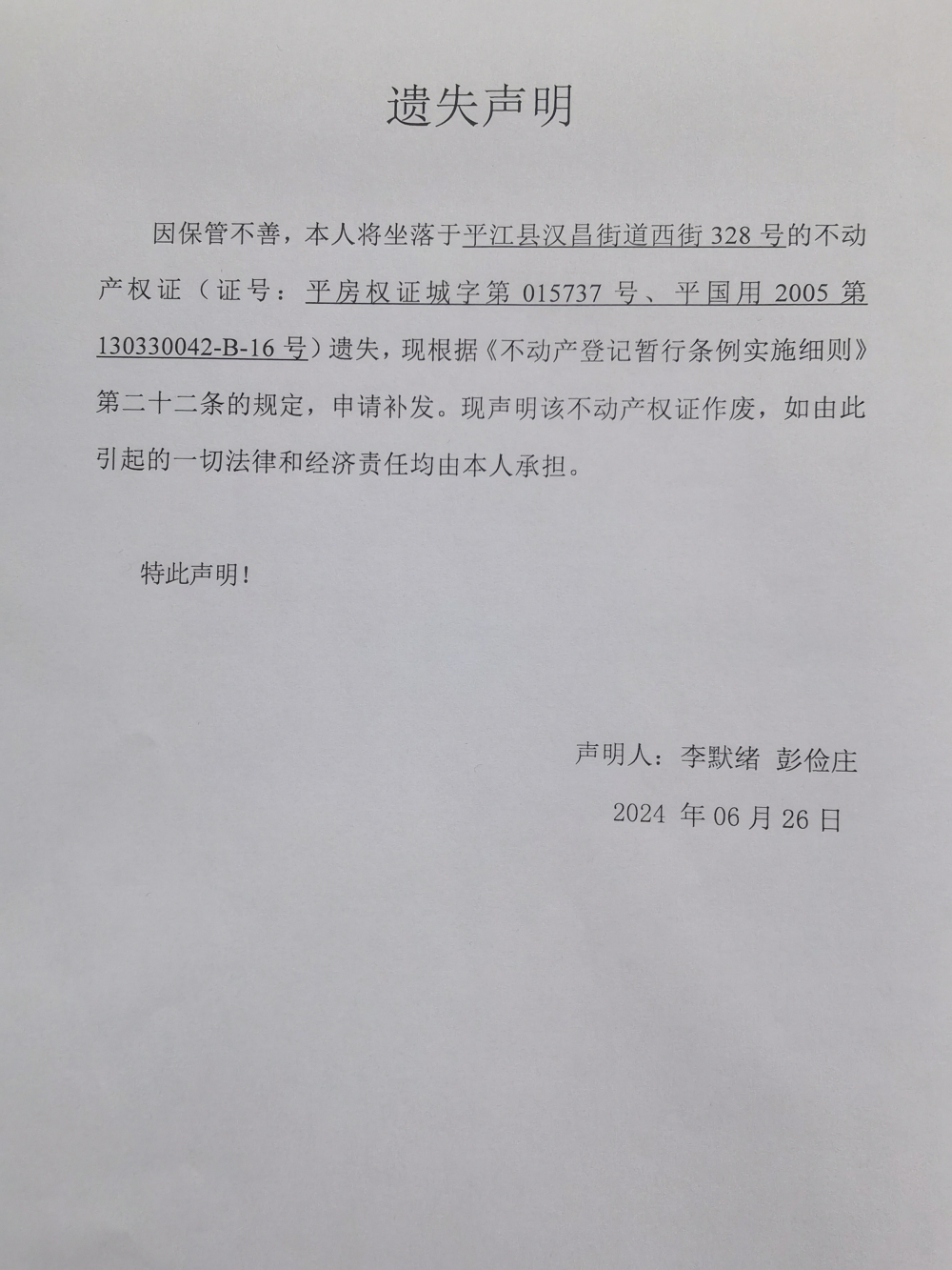 李默绪 彭俭庄不动产权证遗失声明