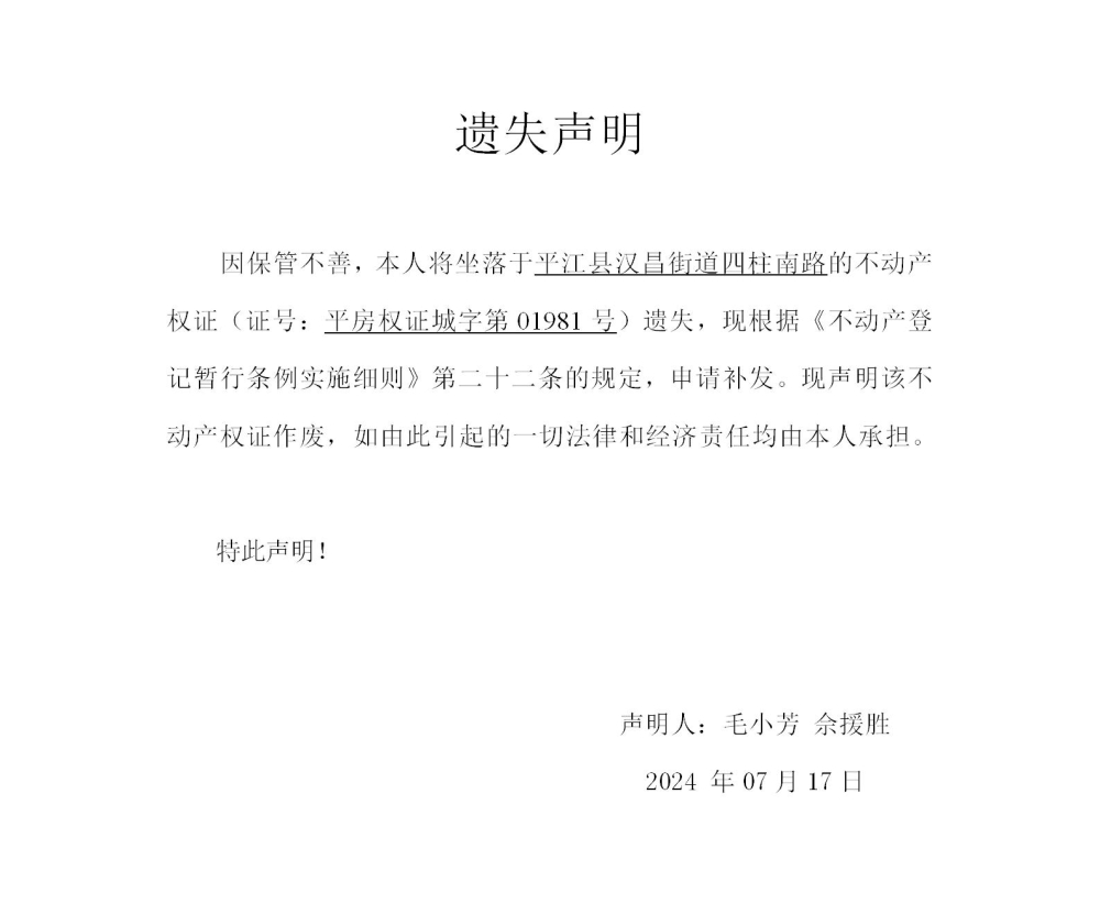 毛小芳 佘援胜不动产权证遗失声明