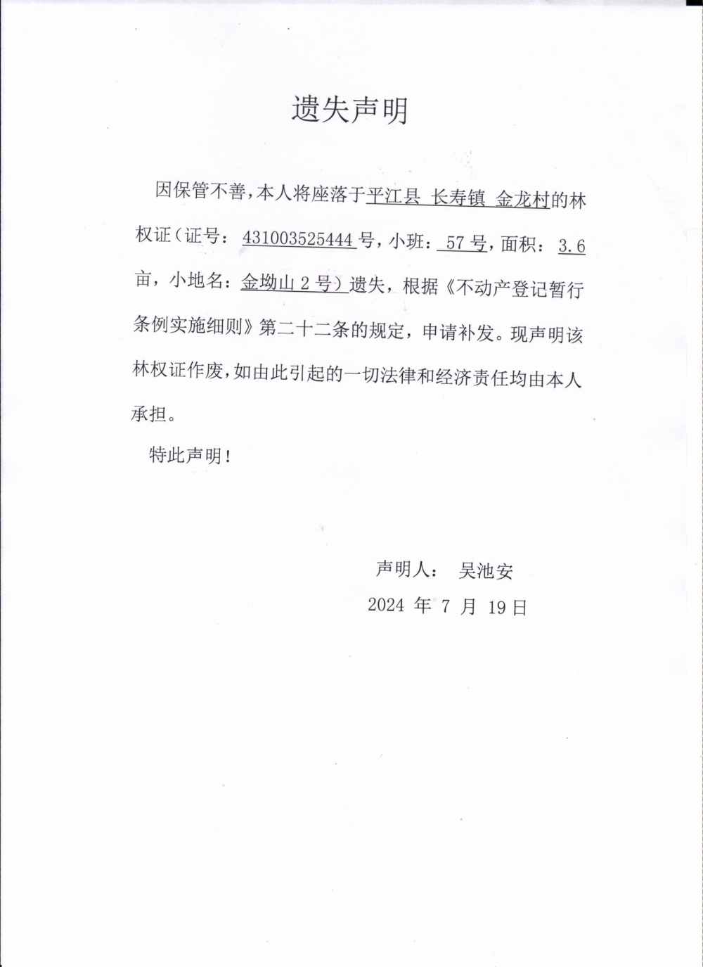 吴池安林权证遗失声明