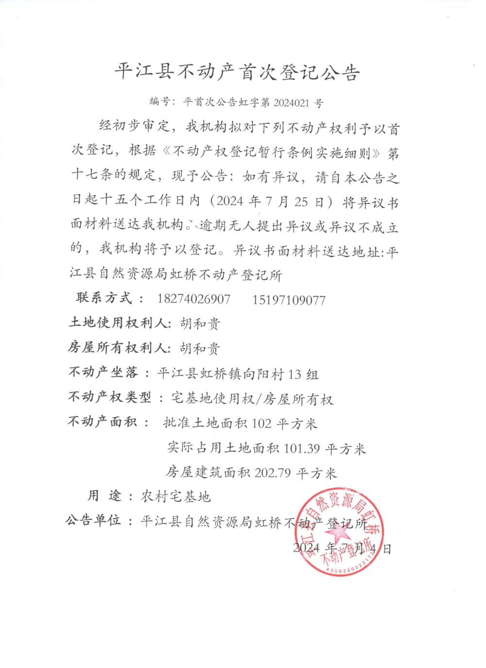 胡和贵不动产首次登记公告