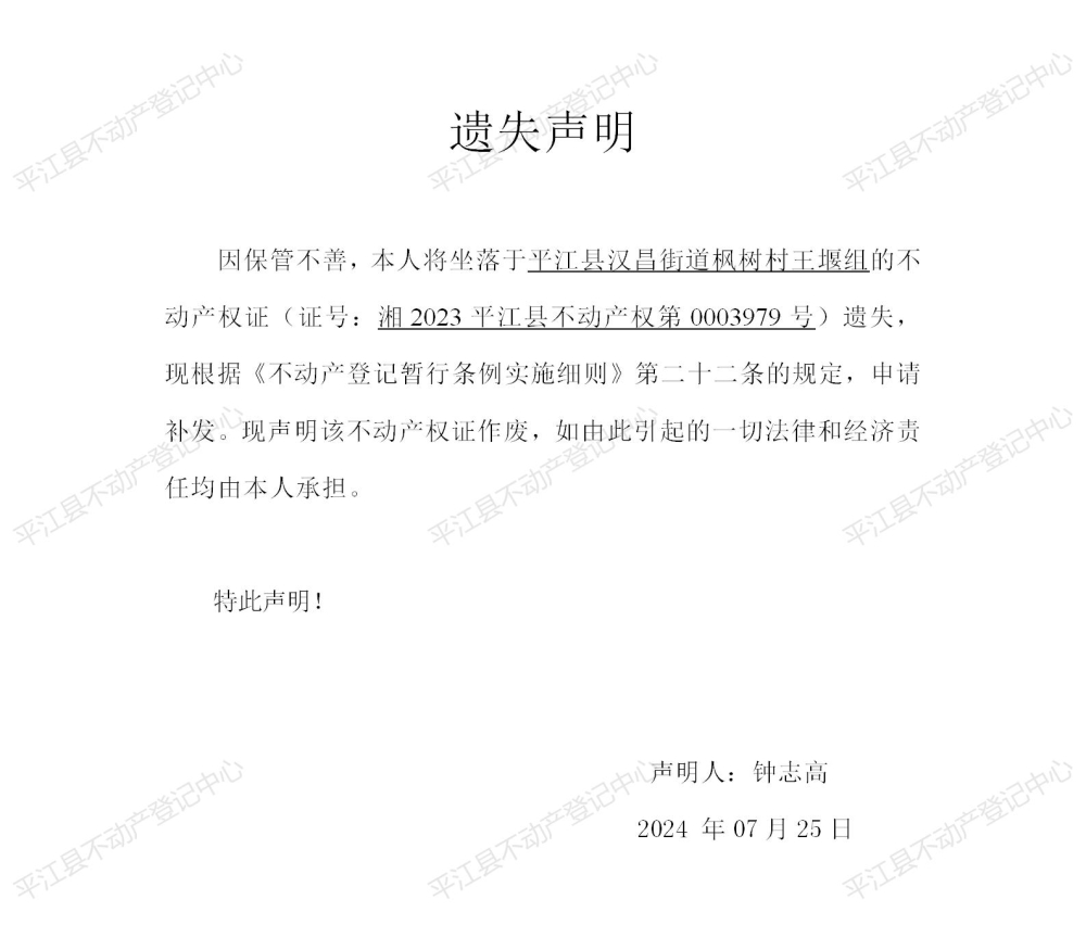 钟志高 不动产权证遗失声明