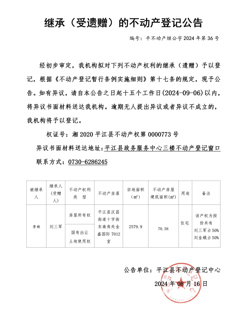 刘三军继承不动产登记公告202436