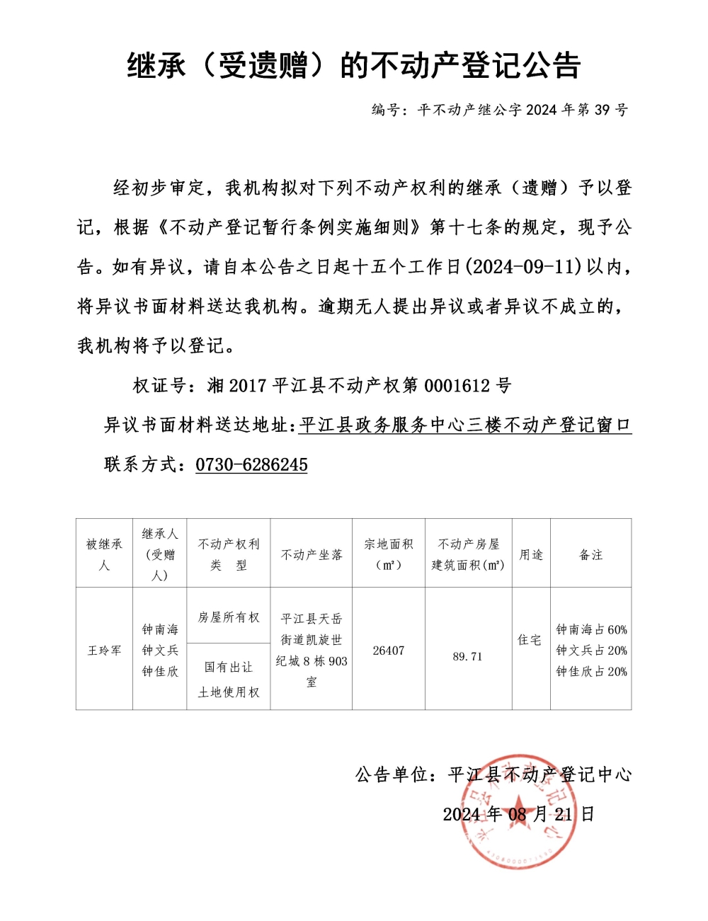 钟南海、钟文兵、钟佳欣继承不动产登记公告202439