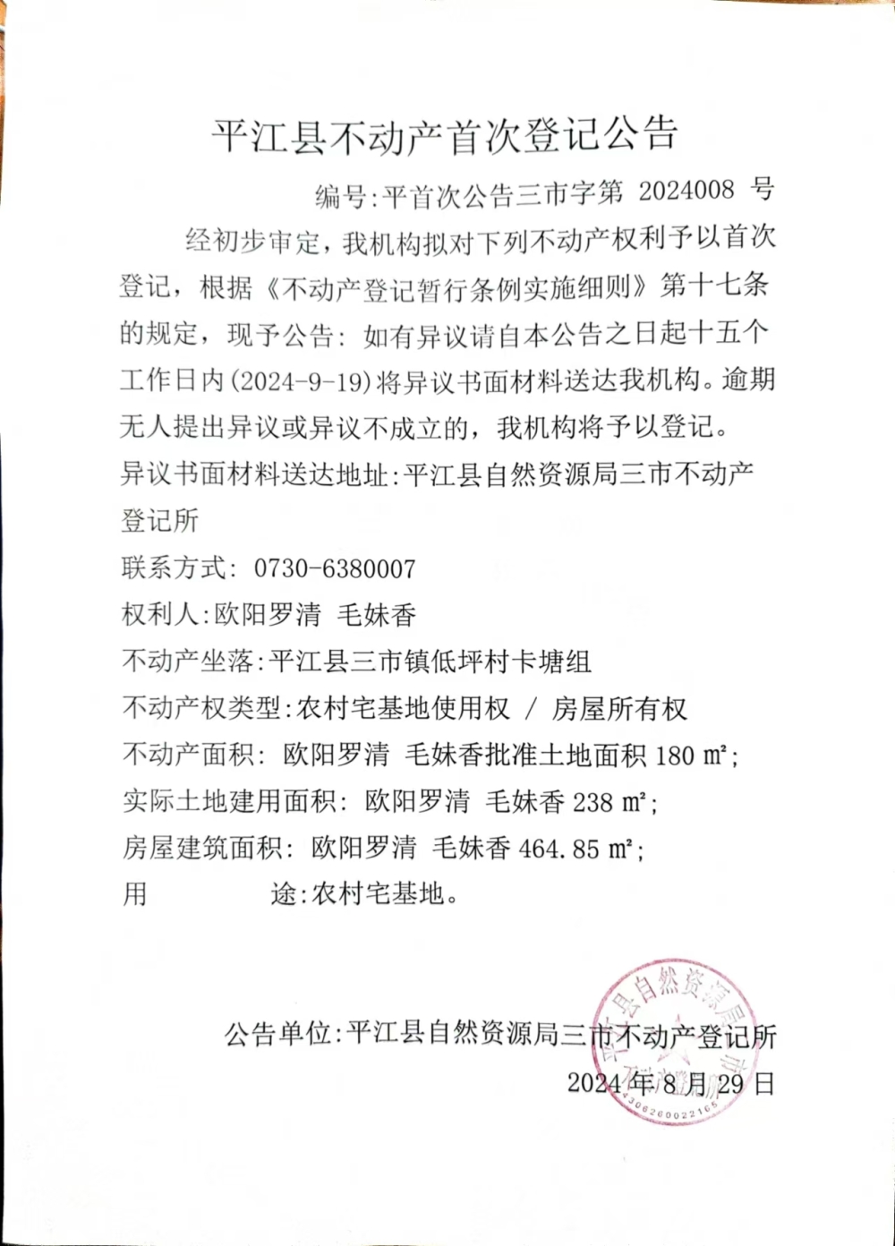 欧阳罗清 毛妹香不动产首次登记公告