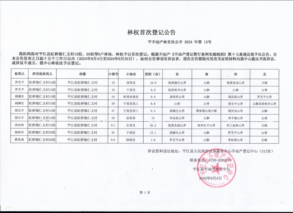 虹桥镇仁义村15、20组等6户林权首次登记公告