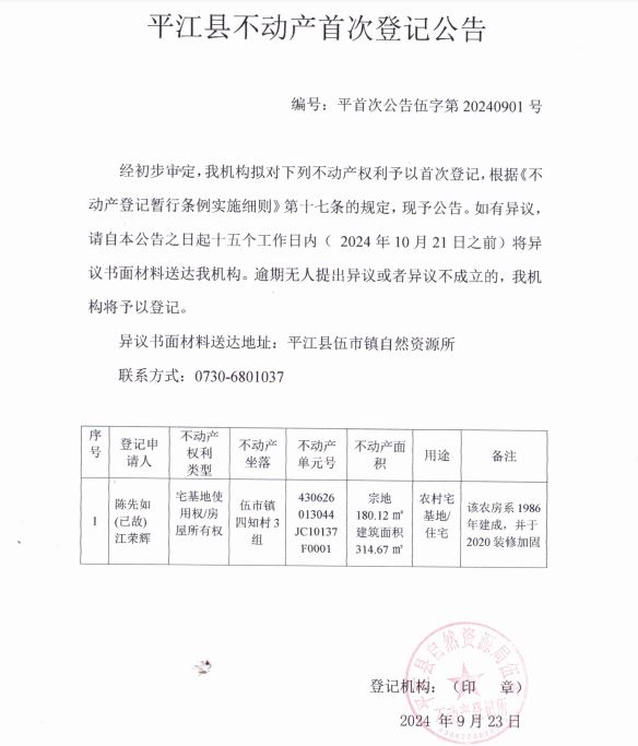 伍市镇陈先如(已故)、江荣辉不动产首次登记