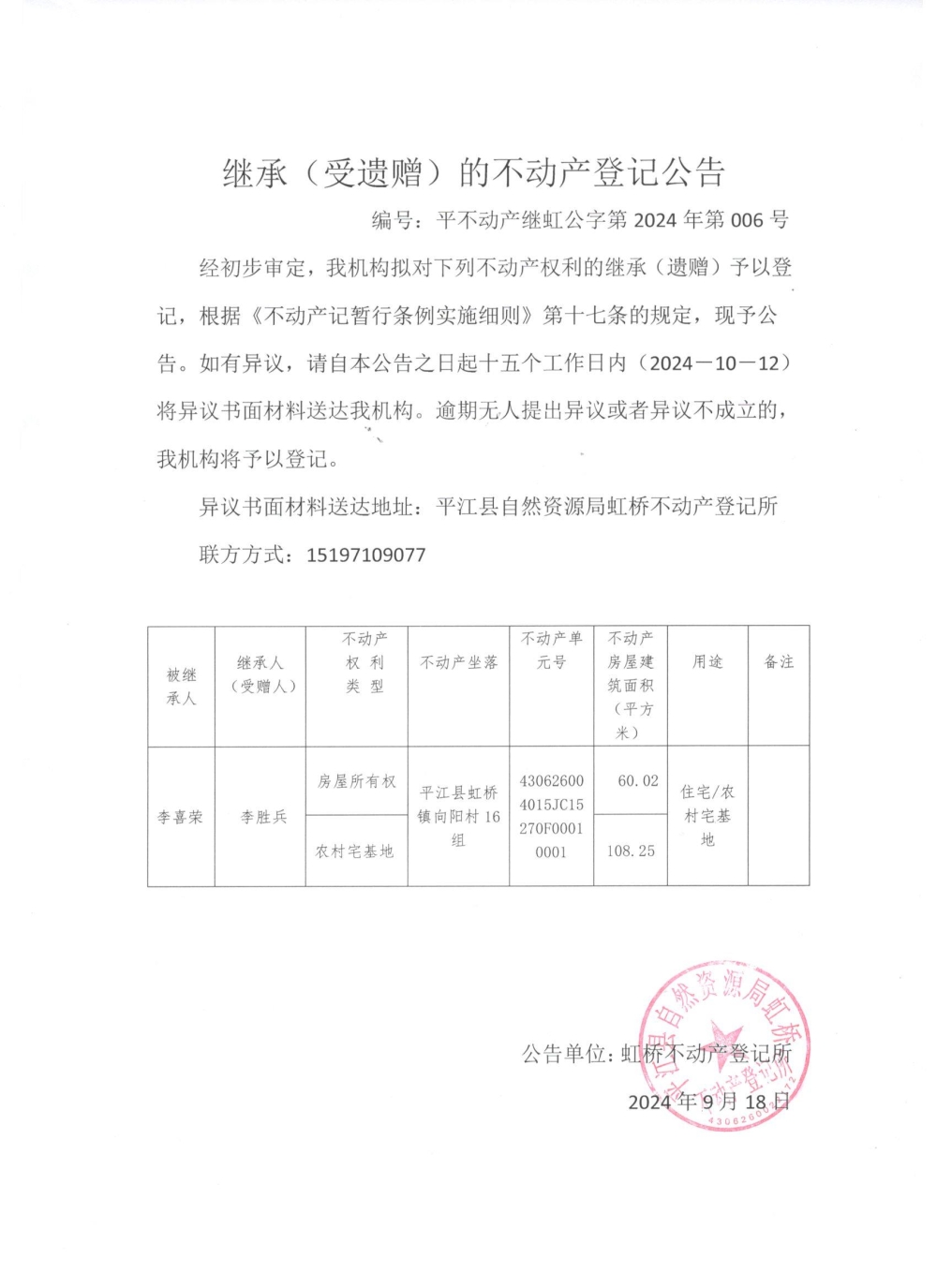 李胜兵不动产受继承登记公告