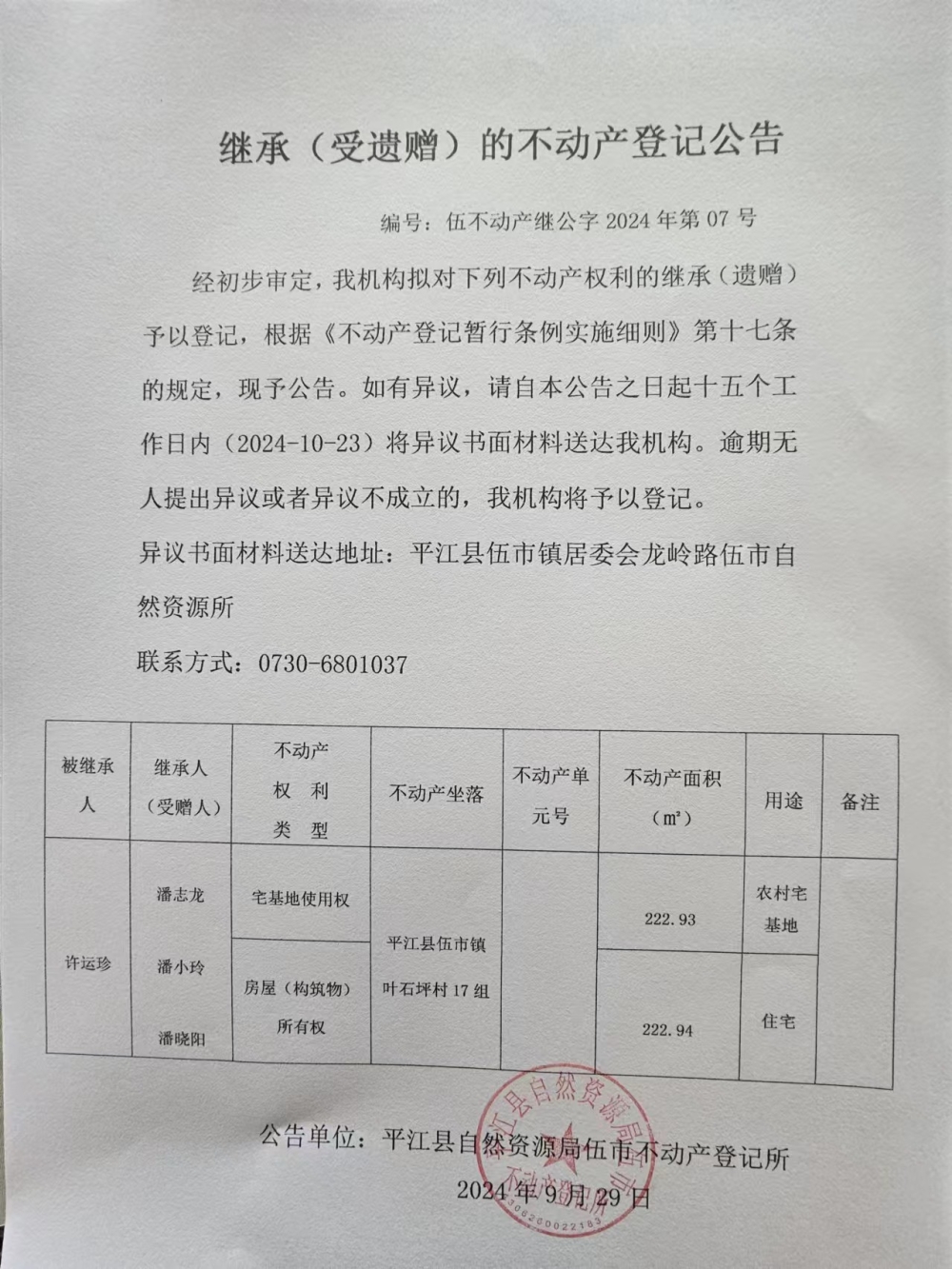 潘志龙 潘小玲 潘晓阳 继承(受遗赠)的不动产登记公告