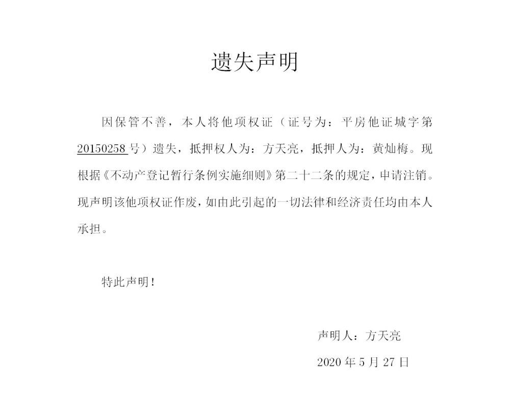 方天亮房产他项权证遗失声明