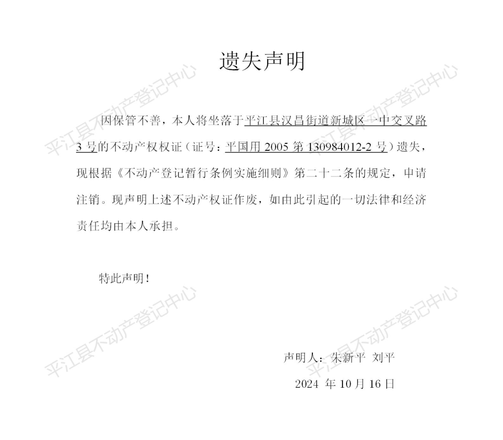 朱新平 刘平 不动产权证遗失声明
