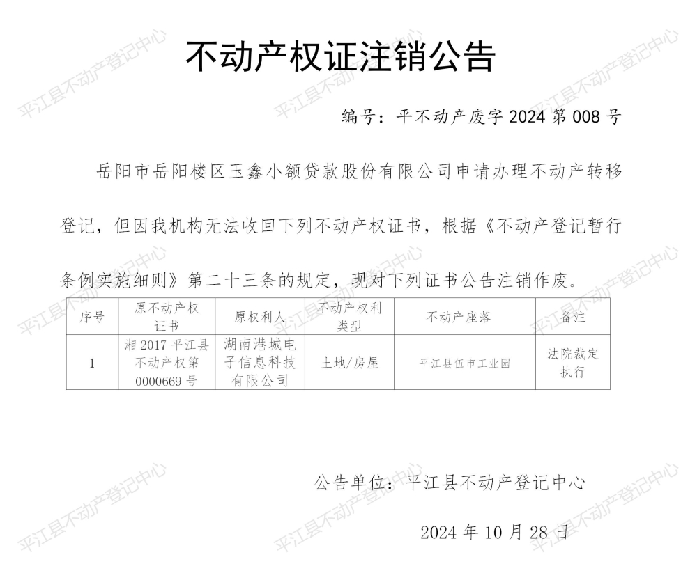 湖南港城电子信息科技有限公司不动产权证注销作废公告2024008