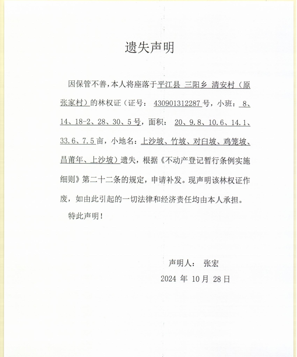 张宏林权证遗失声明