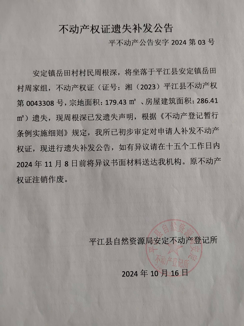 安定镇岳田村周根深宅基地及房屋所有权首次登记