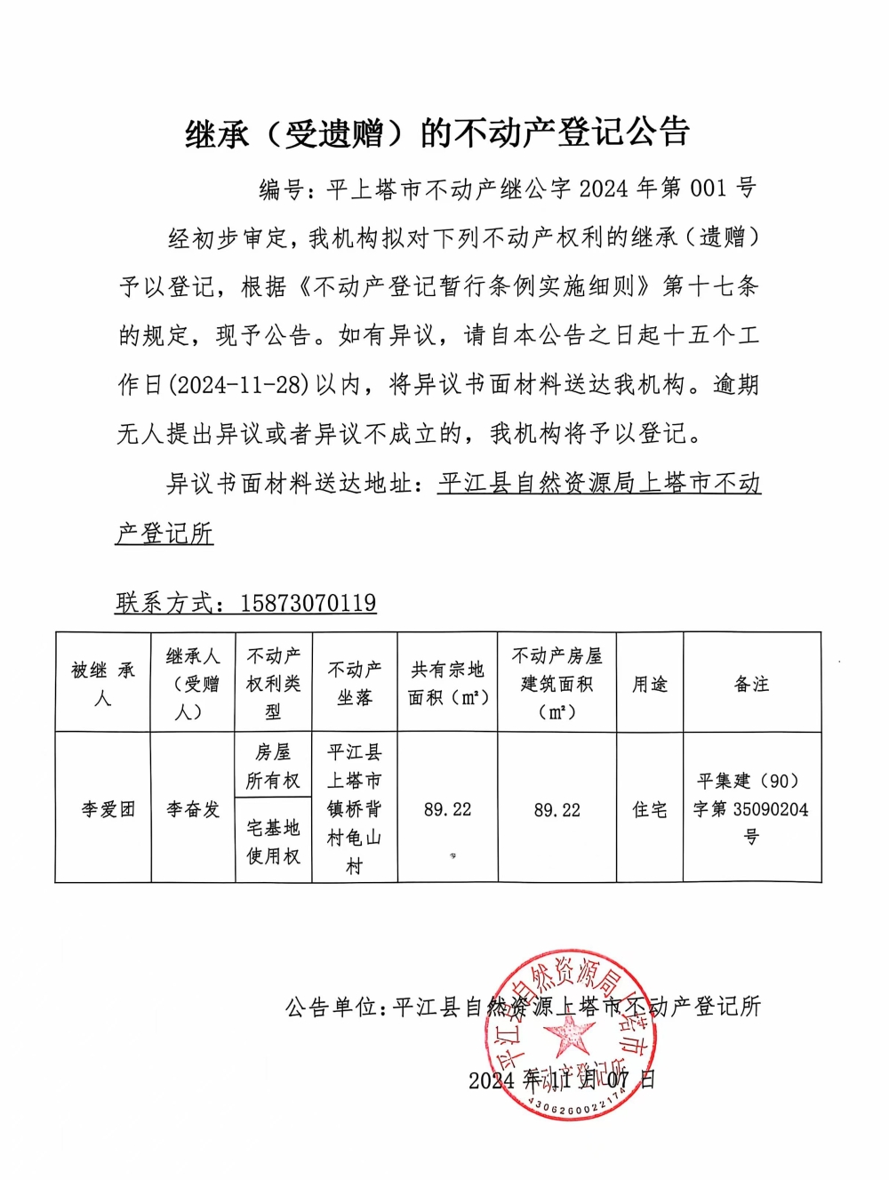李奋发继承(受遗赠)不动产登记公告
