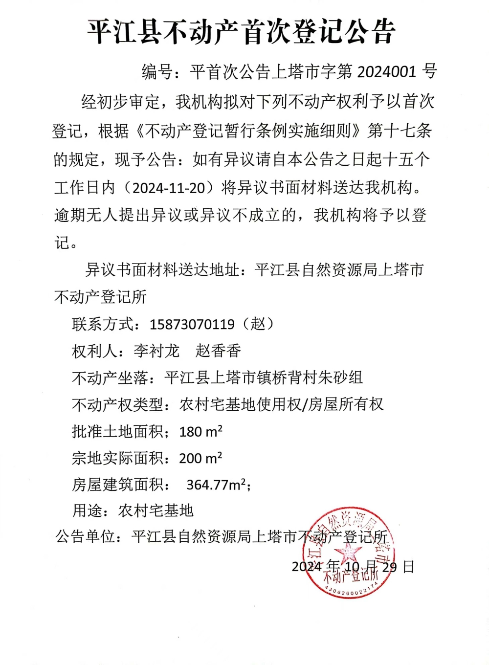 李衬龙 赵香香不动产首次登记公告