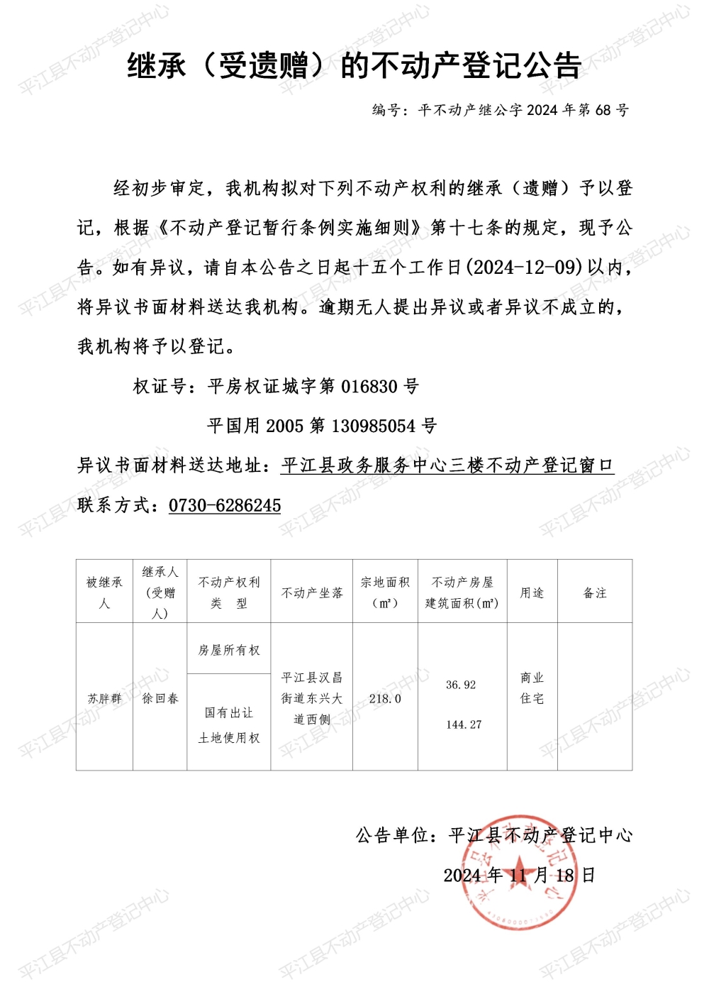 徐回春 继承不动产登记公告202468