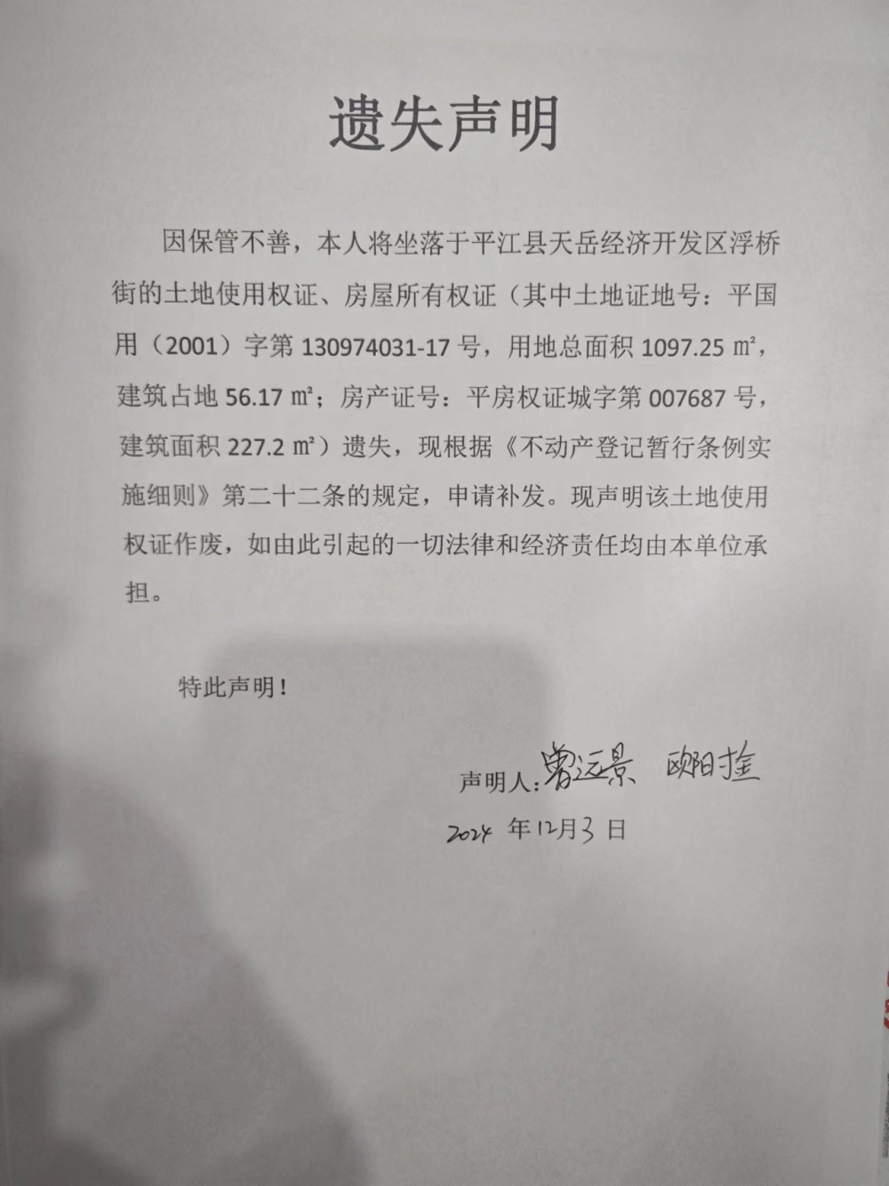 曾远景 欧阳寸金名下天岳经济开发区浮桥街房产证土地证遗失声明