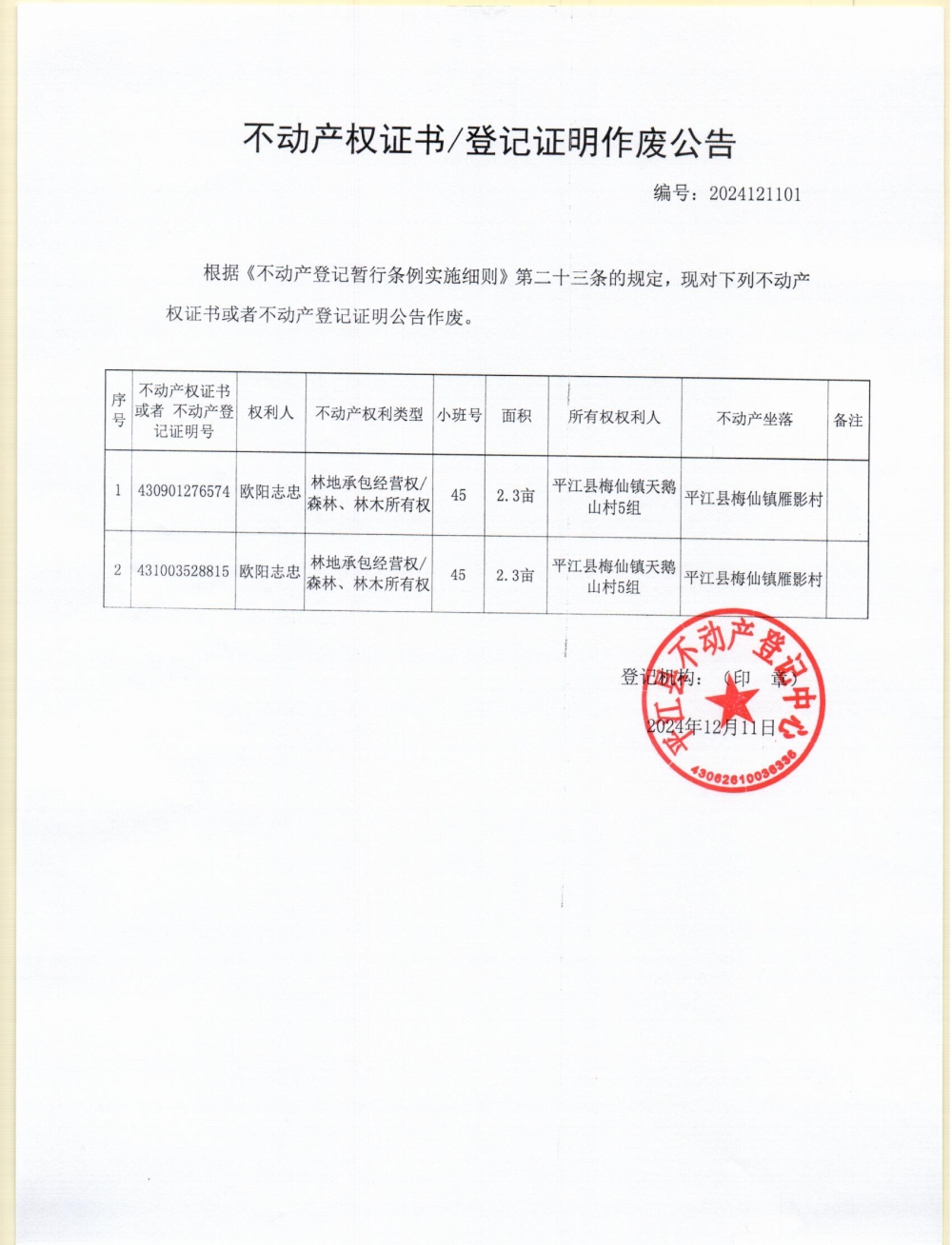 梅仙天鹅山村欧阳志忠林权小班作废公告