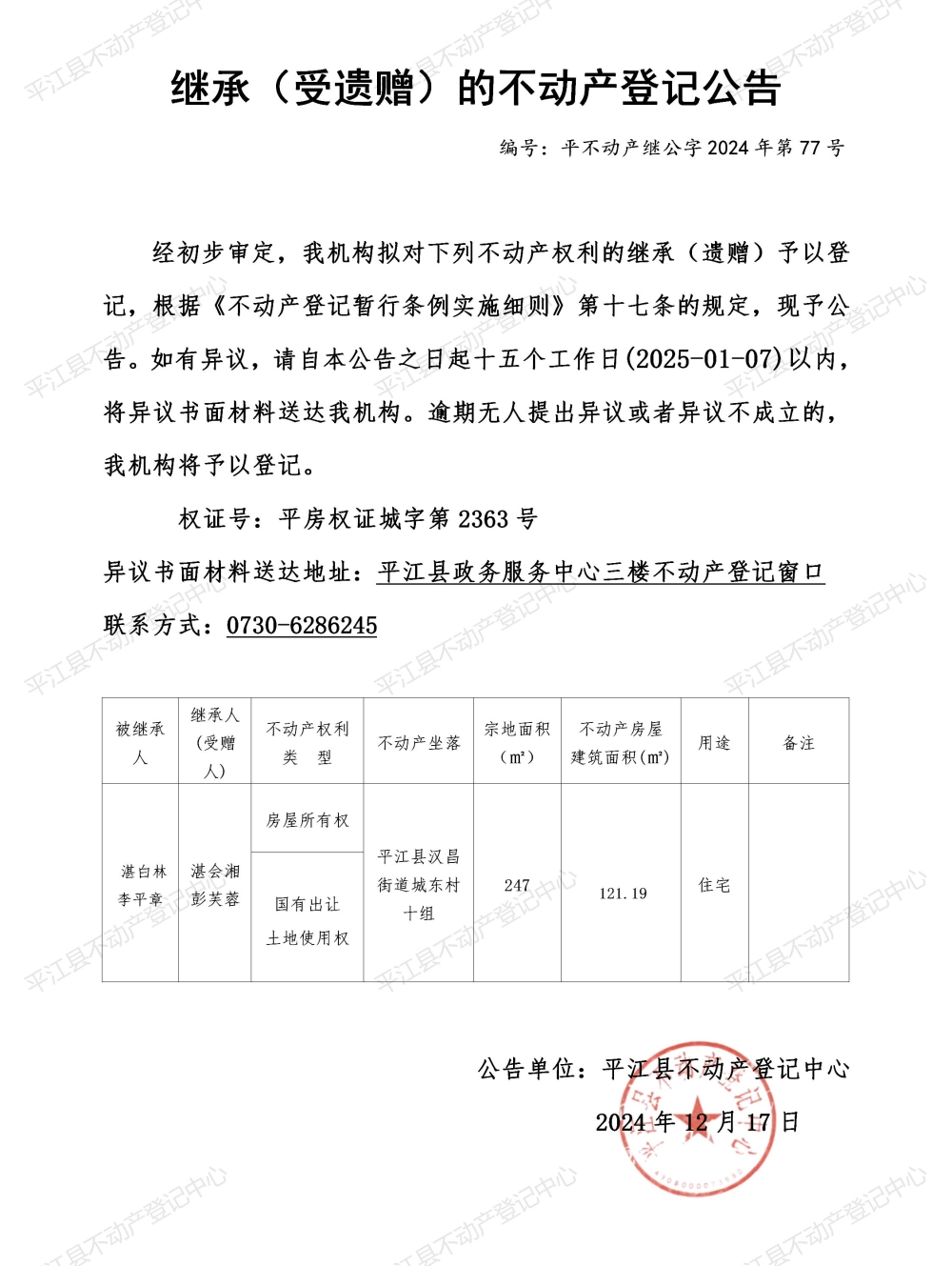 湛会湘 彭芙蓉 继承不动产登记公告202477