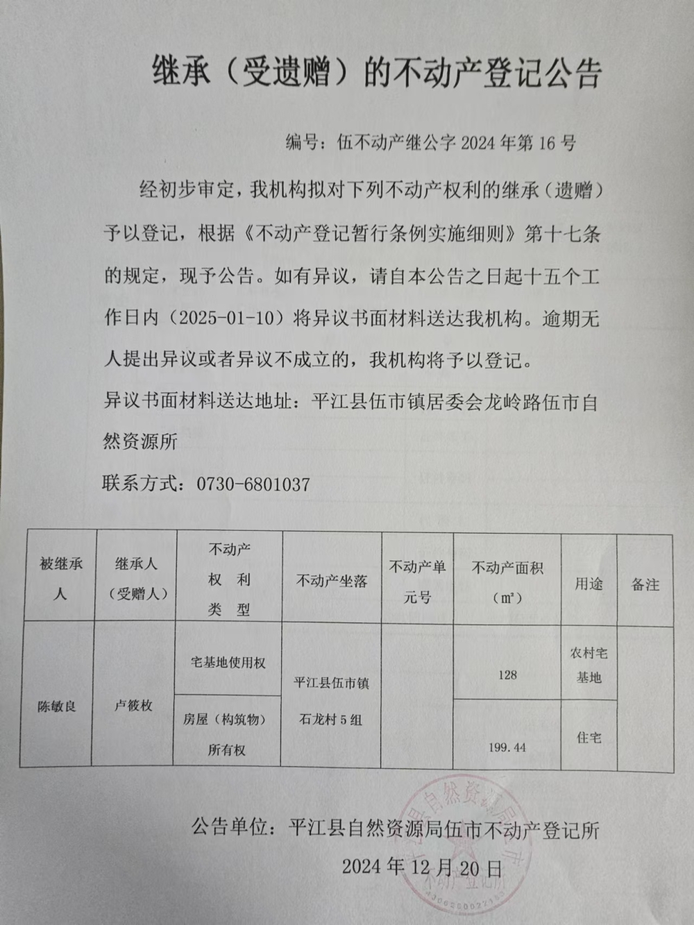 卢筱枚 继承(受遗赠)的不动产登记公告