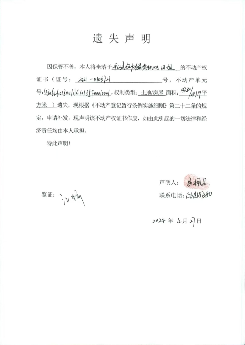 易拥军 不动产权证遗失声明