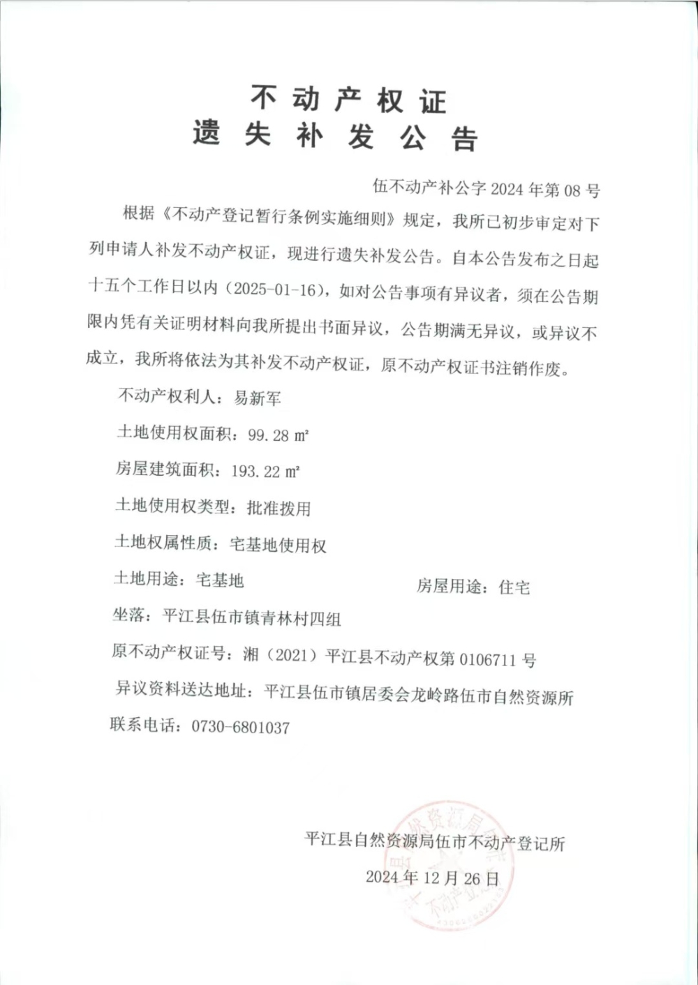 易新军 不动产权证遗失补发公告
