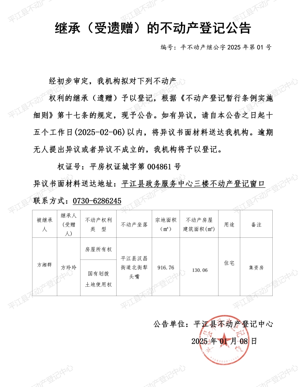方玲玲 继承不动产登记公告202501