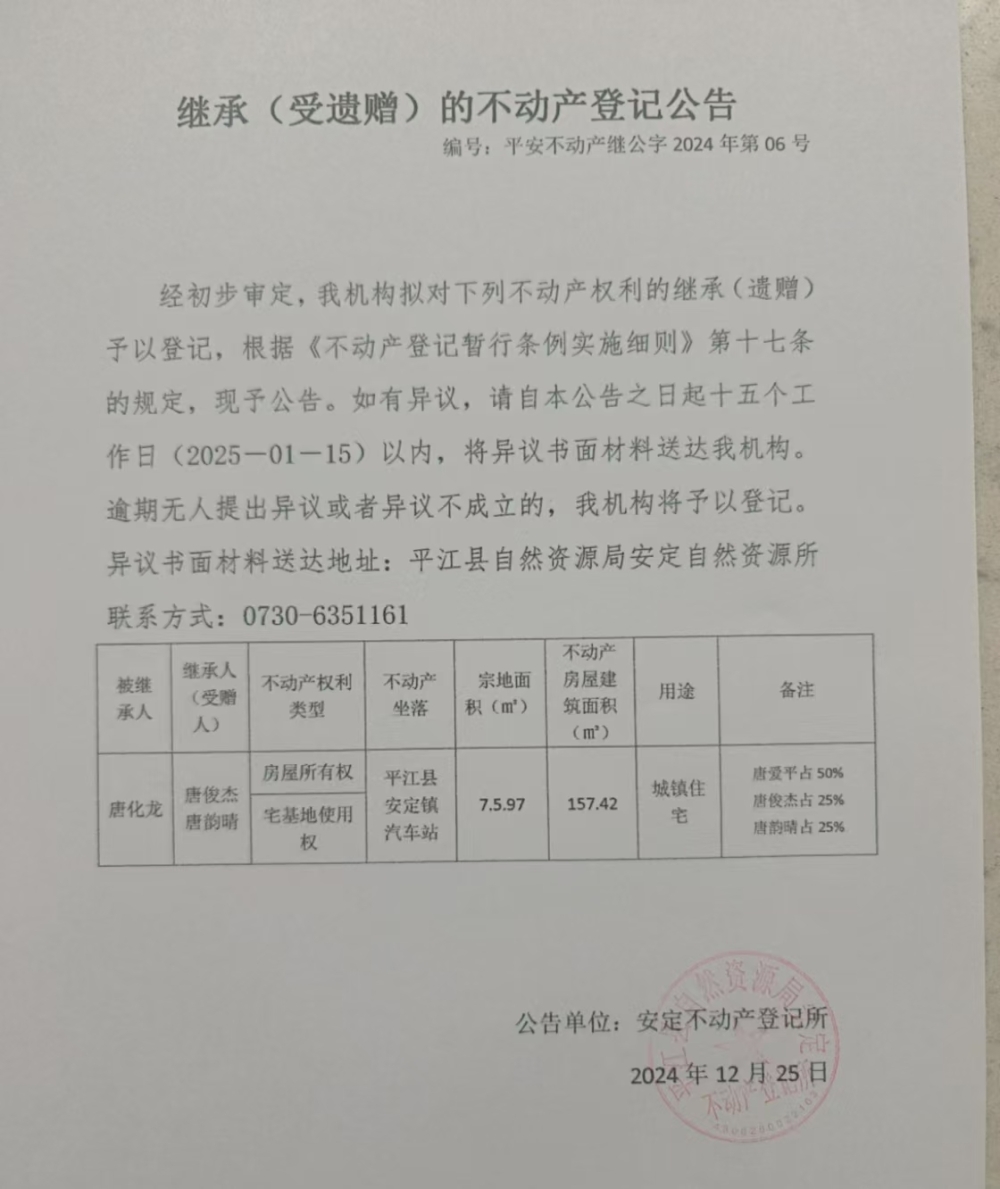 安定镇唐俊杰 唐韵晴继承唐化龙不动产登记公告