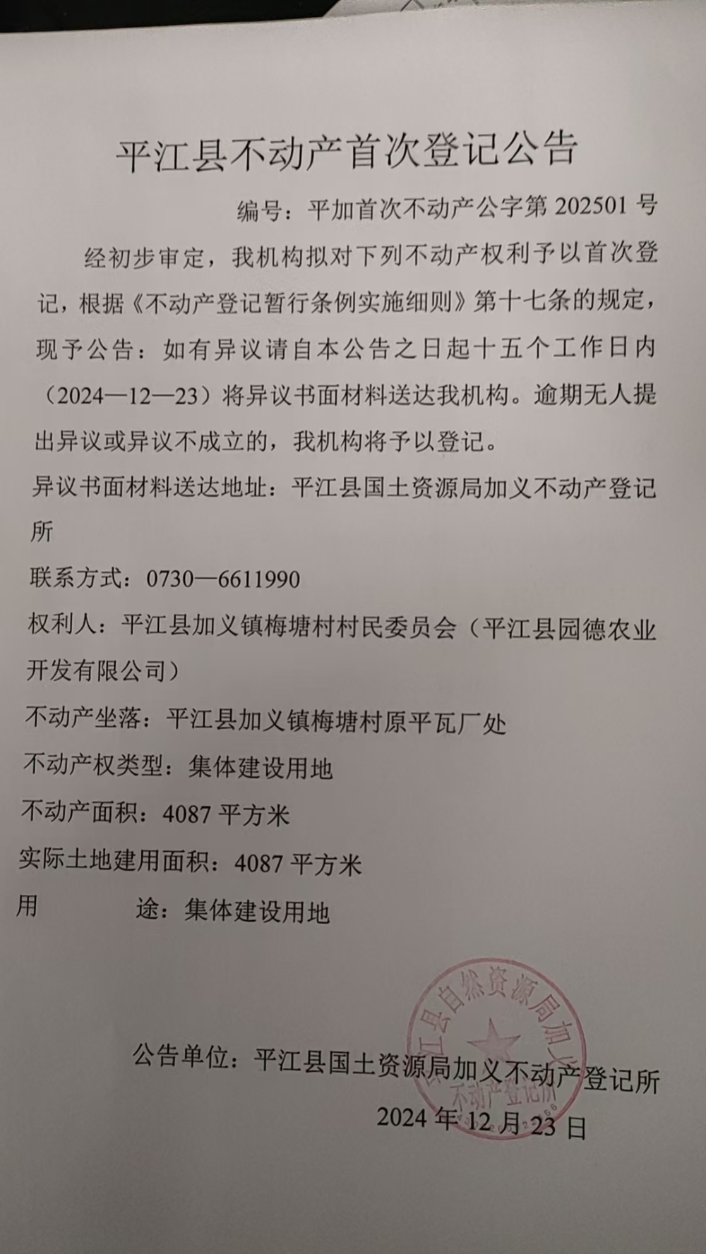 加义镇梅塘村村民委员会(平江县园德农业开发有限公司)集体建设用地使用权登记公告