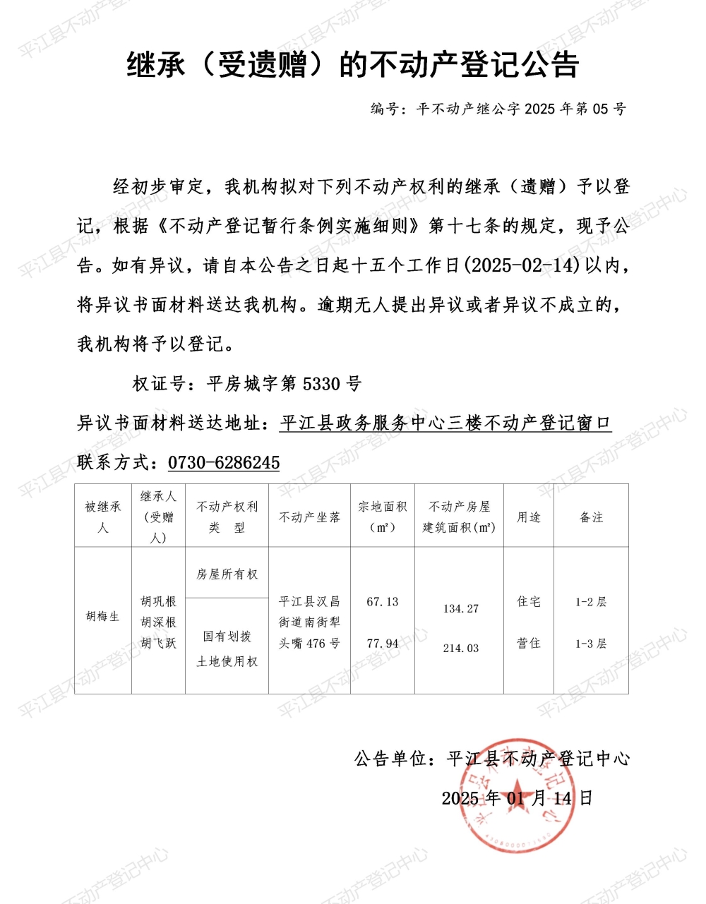 胡巩根 胡深根 胡飞跃 继承不动产登记公告202505