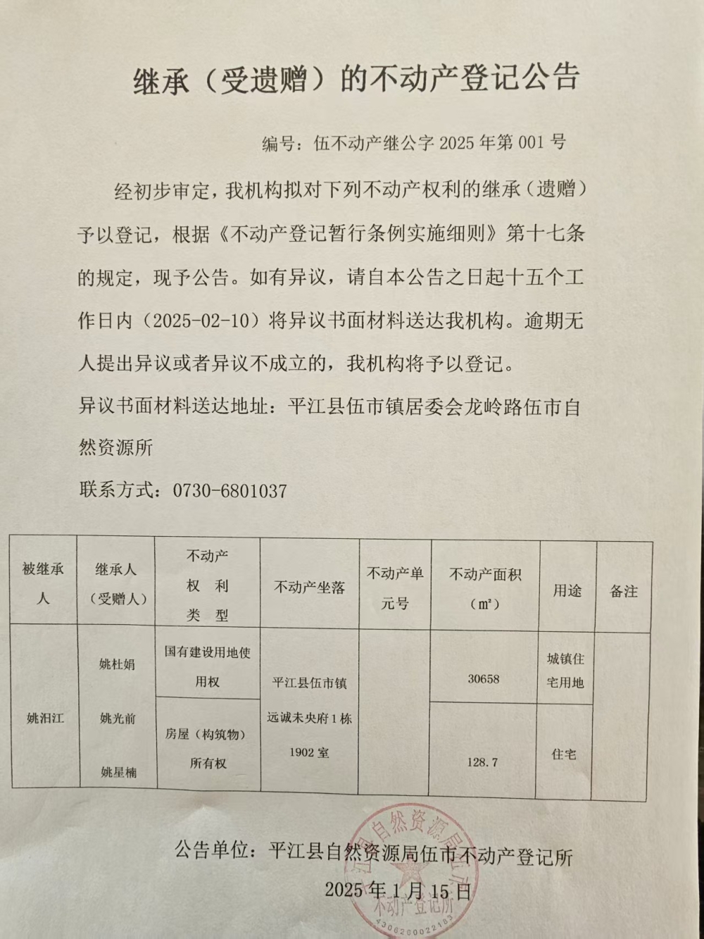 姚杜娟 姚光前 姚星楠 继承(受遗赠)的不动产登记公告