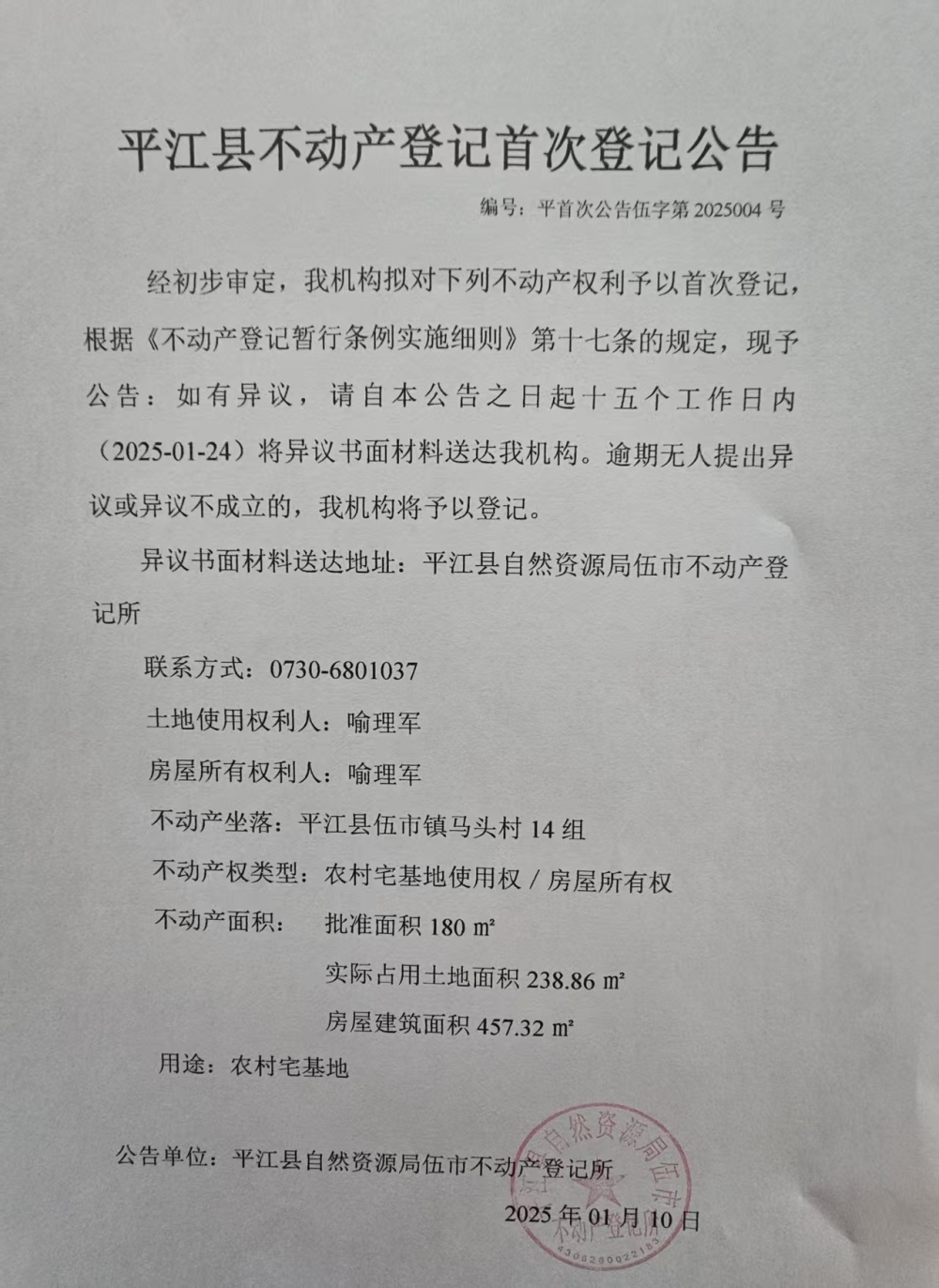 喻理军 不动产登记首次登记公告
