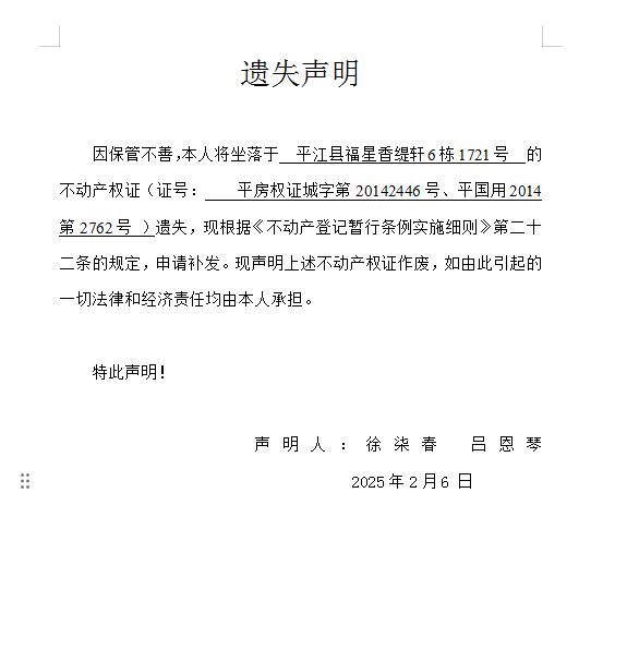 徐柒春 吕恩琴名下福星香缇轩6栋1721号不动产权证遗失声明
