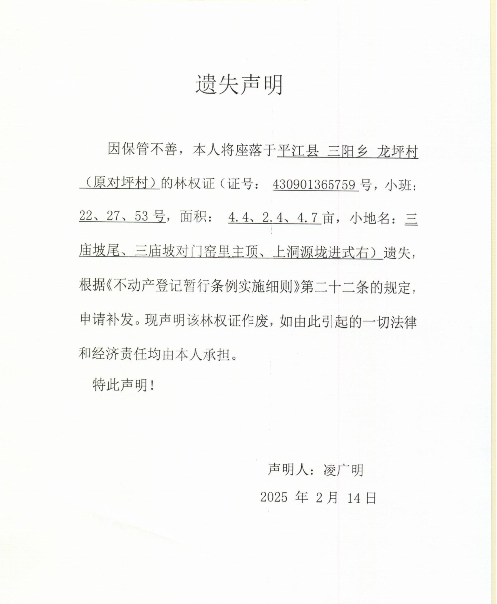 凌广明林权证遗失声明