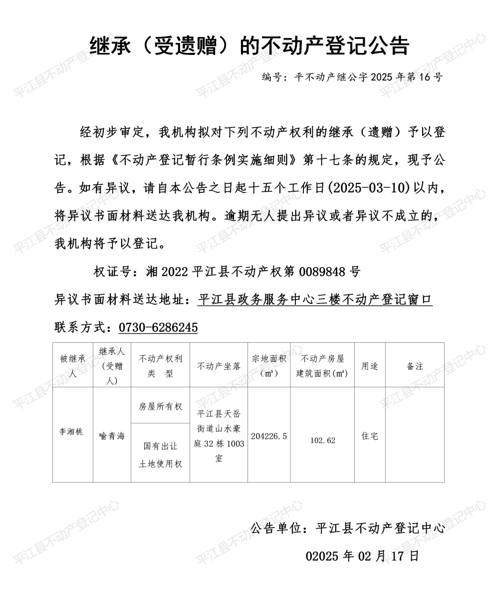 喻青海 继承不动产登记公告202516