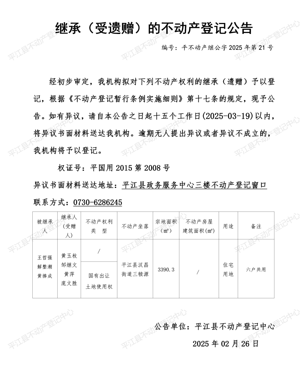 黄玉枚 邹继文 黄萍 庞文胜 继承不动产登记公告202521