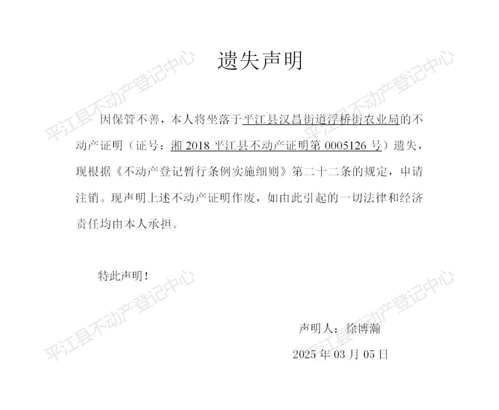 徐博瀚 不动产证明遗失声明202515