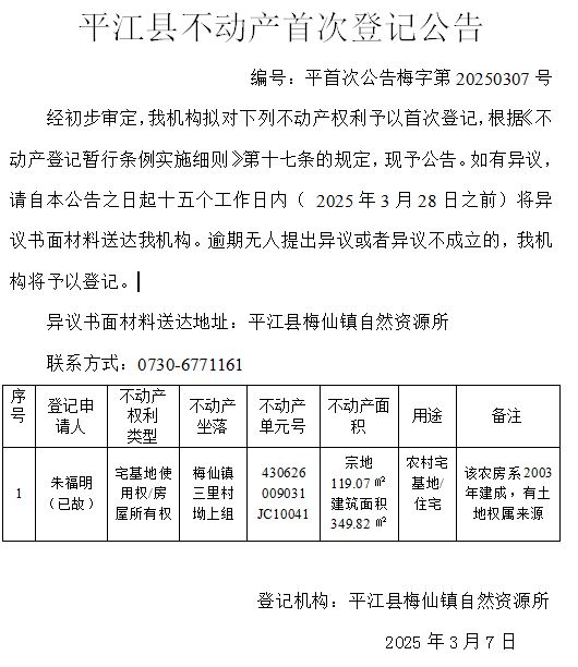梅仙镇三里村坳上组朱福明宅基地首次登记