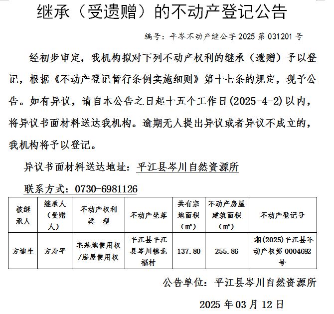 岑川镇龙福村方寿平继承方迪生宅基地登记公告