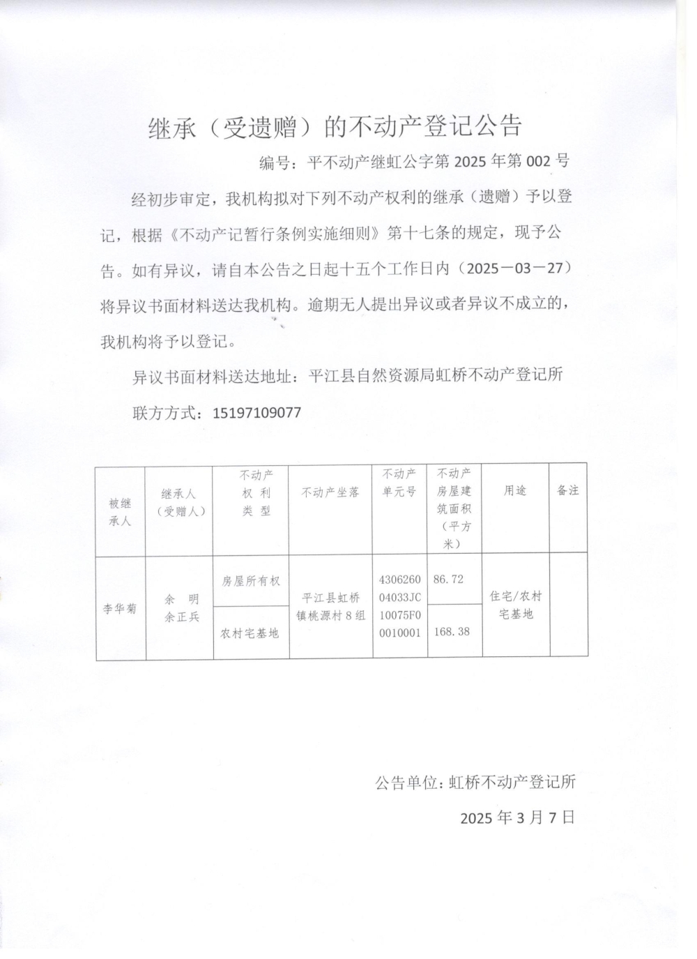 余明 余正兵不动产继承公告