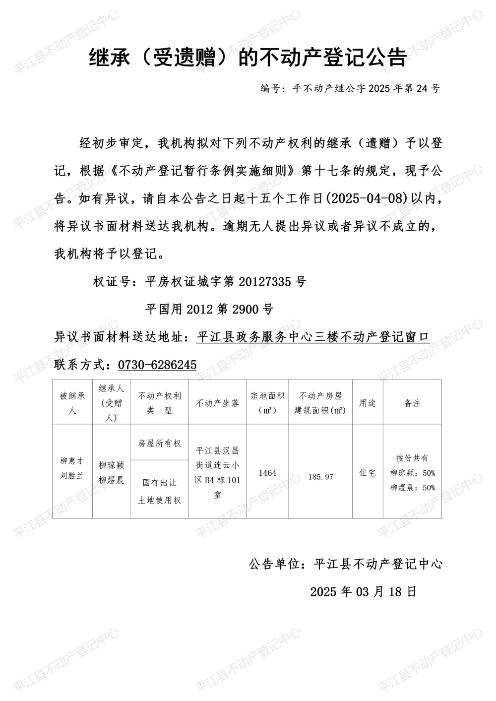 柳琼颖 柳煜晨 继承不动产登记公告202524
