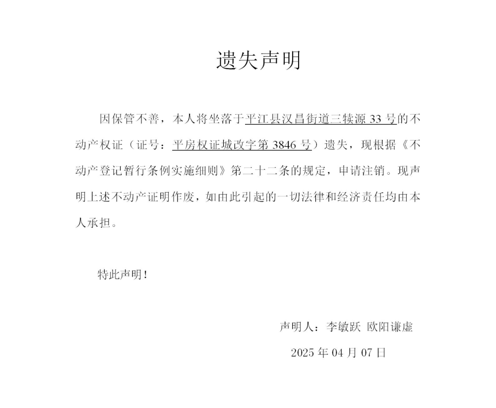 李敏跃 欧阳谦虚 不动产证明遗失声明202523