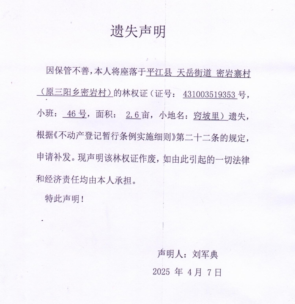 刘军典林权证遗失声明