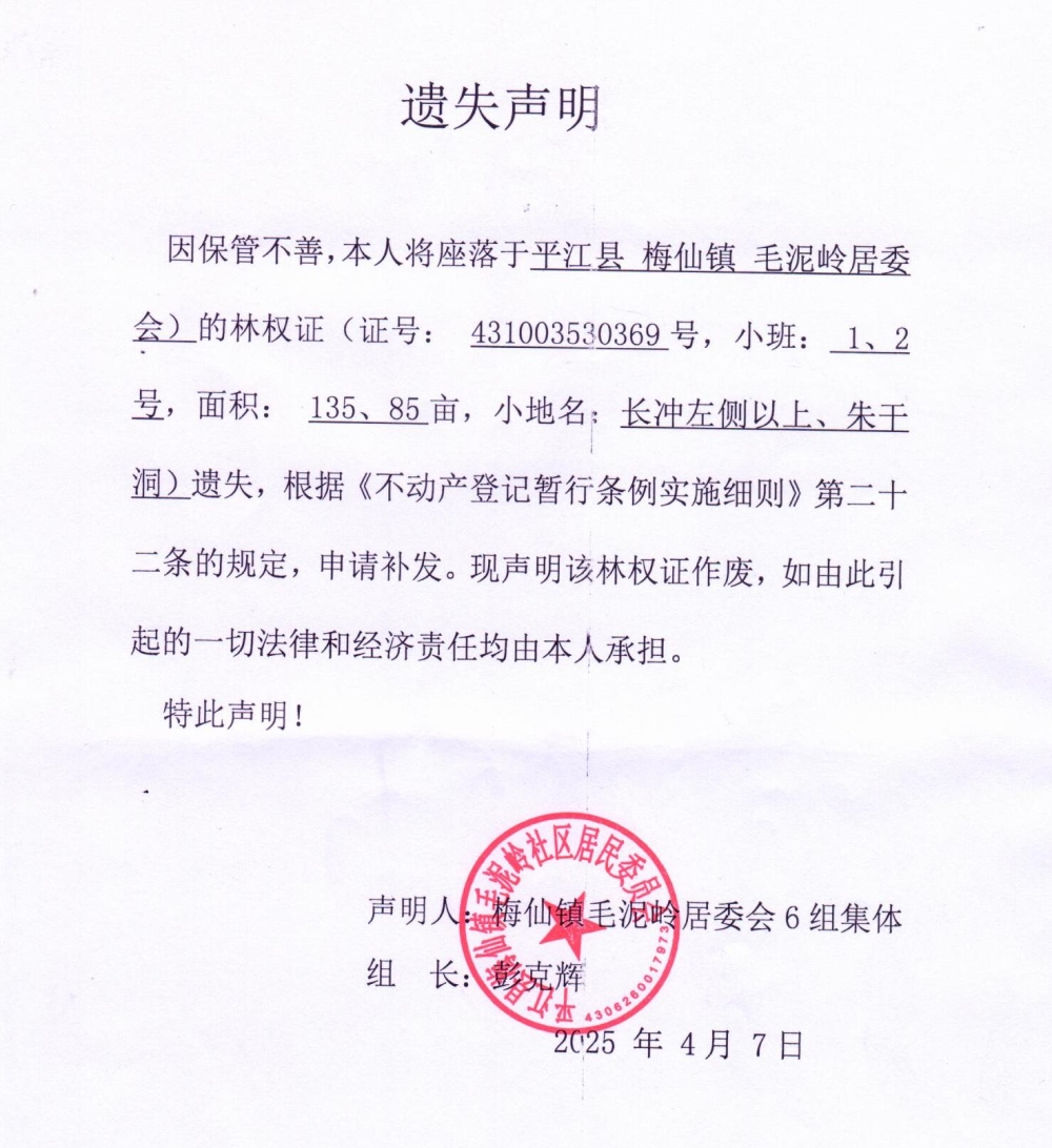 梅仙镇毛泥岭居委会6组林权证遗失声明