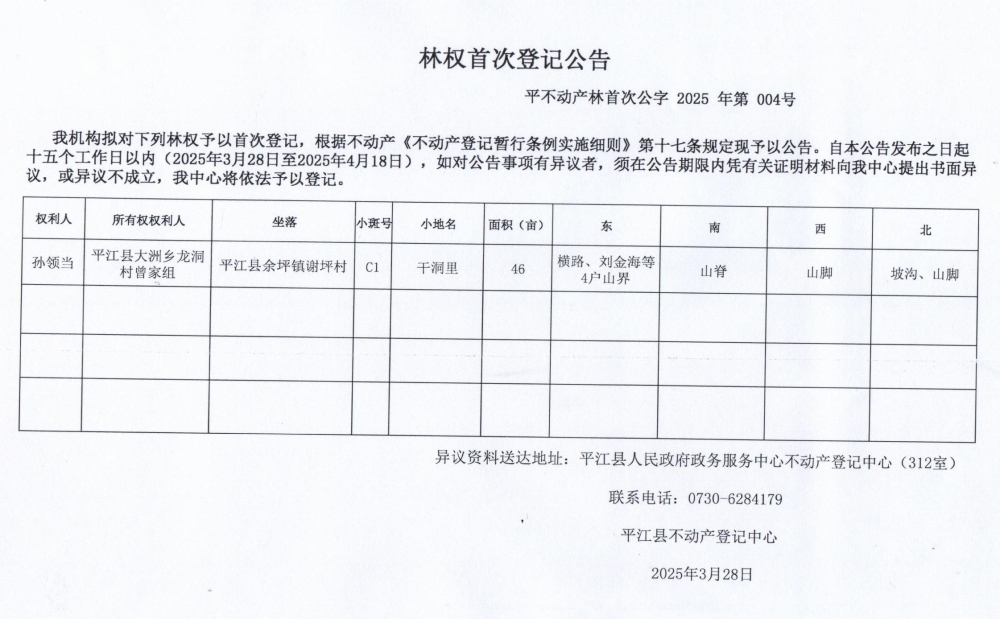 孙领当林权首次登记公告